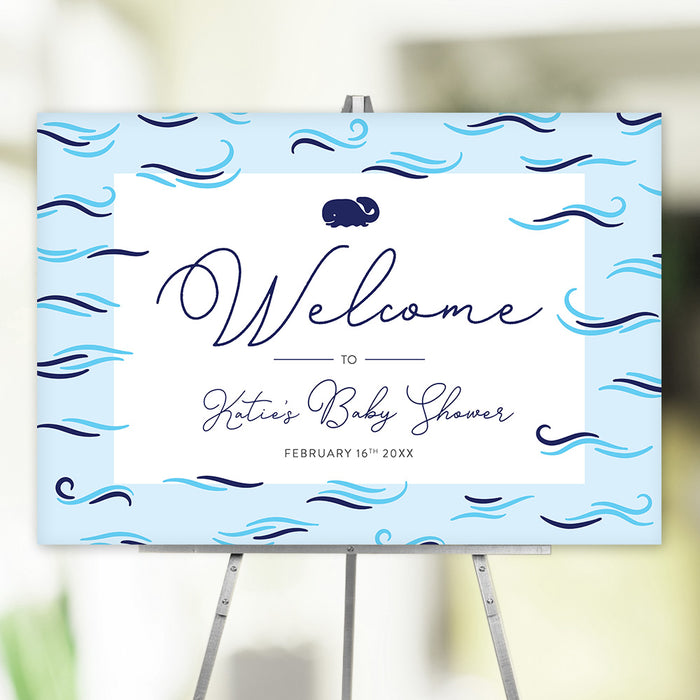 Welcome your guests with ocean-inspired charm using this baby shower welcome sign featuring a sweet blue whale and playful ocean waves. This under-the-sea themed sign is the perfect way to greet friends and family as they arrive to celebrate your little one. Designed with a calming palette of soft blues and navy, along with whimsical wave illustrations, this sign adds an elegant and joyful touch to your baby shower decor.