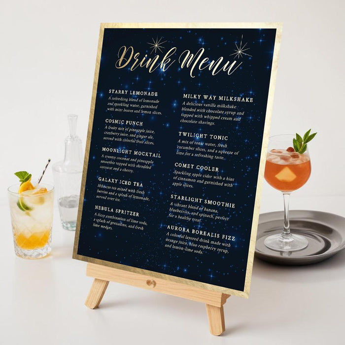 This enchanting starry night sky drink menu sign adds a magical touch to any event. Featuring a celestial-inspired design with a deep, starlit backdrop and elegant gold accents, it beautifully showcases a selection of cosmic cocktails and mocktails.