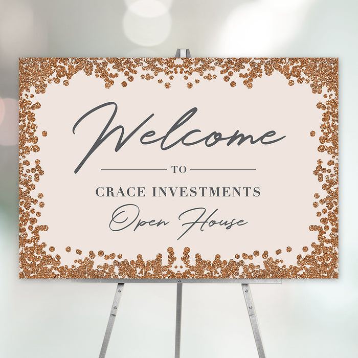 Make a polished first impression with this elegant open house welcome sign, featuring stylish faux gold glitter that adds a refined sparkle to your event. With its clean, modern layout, this sign provides a sophisticated touch to entryways, check-in stations, or presentation areas—perfect for businesses looking to greet clients, partners, and guests with confidence and warmth.