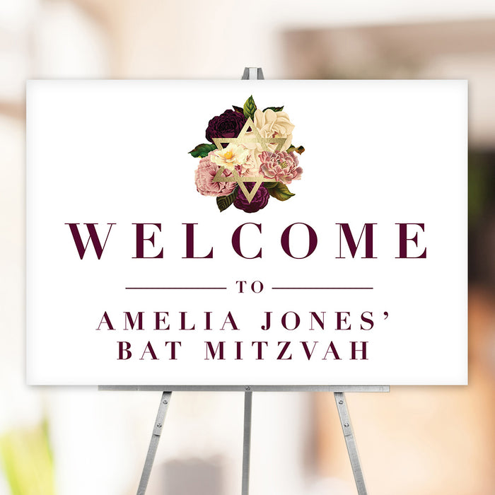 Celebrate this significant milestone with elegance. This elegant Bat Mitzvah welcome sign is the perfect way to greet friends and family as they arrive for your daughter's important celebration. Featuring a refined floral arrangement of blush, burgundy, and cream flowers surrounding a gold Star of David, this customizable welcome sign adds a heartfelt and decorative touch to any Bat Mitzvah event.