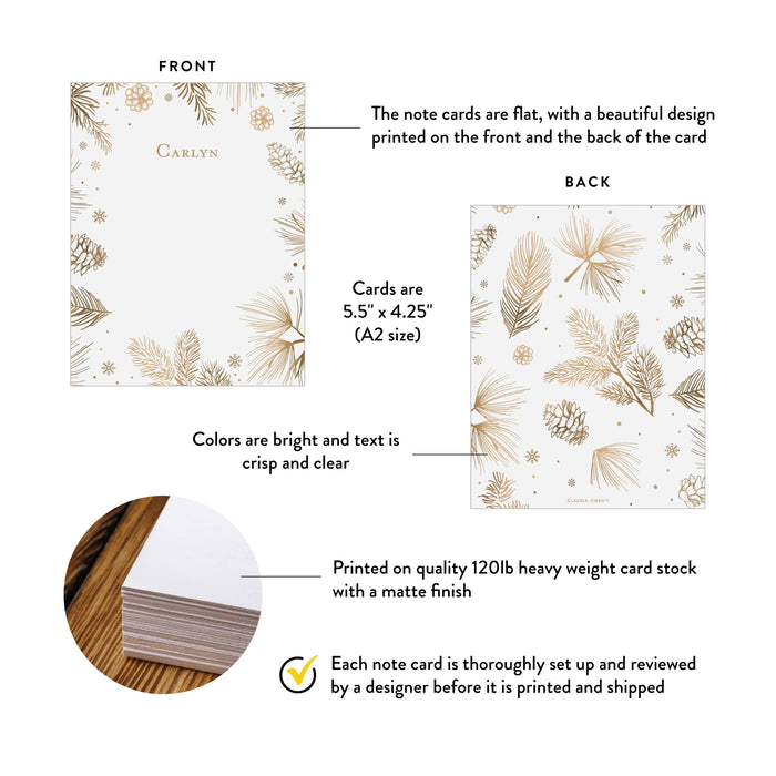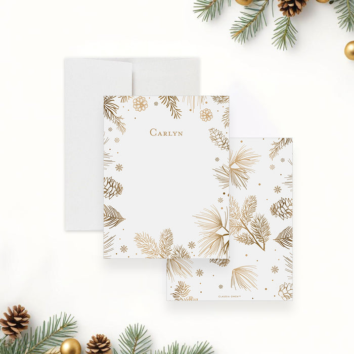 Enhance your holiday correspondence with this personalized note card, featuring a graceful winter botanical design. Adorned with delicate pine boughs, pinecones, and subtle snowflakes in warm gold shades, this notecard adds charm to your holiday messages. It's ideal for those who appreciate thoughtful details—whether you're writing a heartfelt thank you, sending warm holiday wishes, or accompanying a seasonal gift.