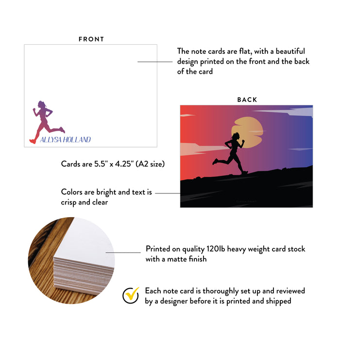Ready to send personalized notes that go the extra mile? This card is your perfect running mate! The front displays your name alongside an inspiring illustration of a female runner, radiating energy and passion. When you flip it over, prepare to be inspired by a silhouette of a runner conquering an uphill challenge under the glorious sun. It's all about that runner's high!