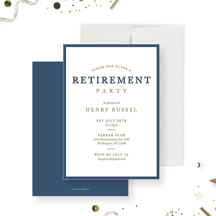 Celebrate a remarkable career with this sophisticated retirement party invitation! Featuring elegant typography on a crisp white background with a tasteful blue border, this design exudes class and simplicity. Perfect for honoring years of dedication and hard work, this invitation sets the tone for a memorable farewell gathering.