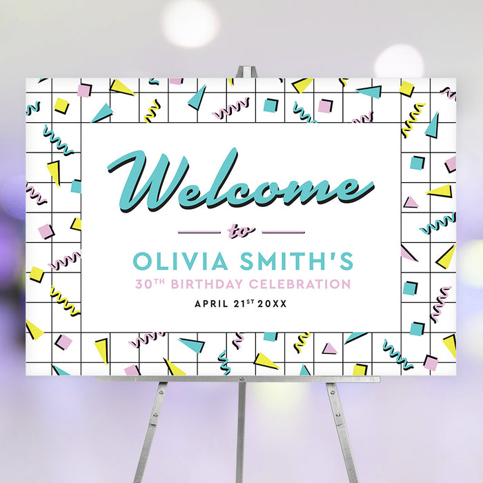 Throw it back to the vibrant days of the ’80s and ’90s with this bold, playful welcome sign! Packed with nostalgic charm, this lively design features a grid backdrop with colorful geometric shapes, curly confetti squiggles, and a retro palette of teal, pink, yellow, and black. Whether you're hosting a dance party, backyard bash, or themed dinner, this sign is sure to transport your guests straight to the era of cassette tapes, roller rinks, and arcade lights.
