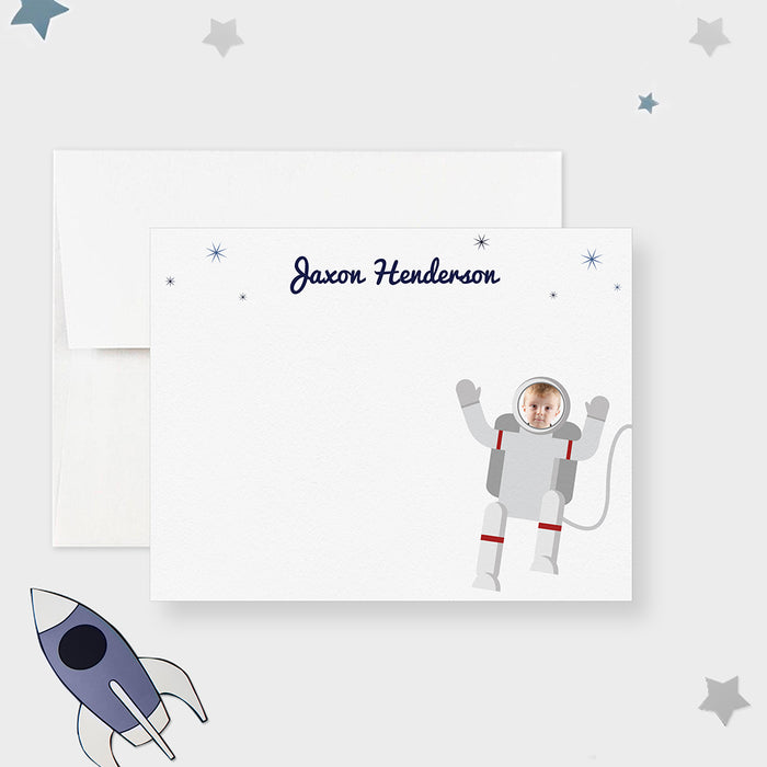 Make thank-you notes feel out of this world with these personalized astronaut cards for kids. Featuring a fun space theme and the option to include your child’s photo in the astronaut helmet, this stationery is perfect for space-themed birthdays, baby showers, or just sending sweet notes. The lunar design continues on the back, adding an extra layer of charm. These cards are printed on quality matte cardstock and personalized with your child’s name to make every message feel special.
