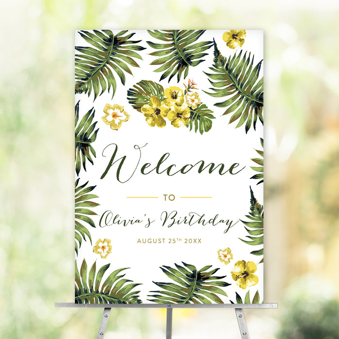 Tropical Welcome Sign for Birthday Party with Palm Leaves and Yellow Hibiscus Flowers, Luau Birthday Party Poster