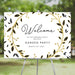 Twilight Garden Party Welcome Sign Showcasing a Black and Gold Wreath Design