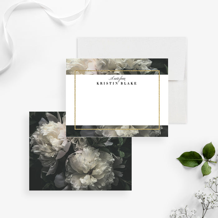 Brighten up someone's day with the timeless elegance of this notecard. Delicate white peony blooms against a rich, dark background, evoking the wonderful allure of spring. This notecard is perfect for expressing gratitude on various special occasions such as weddings, bridal showers, birthdays, and wedding anniversaries.