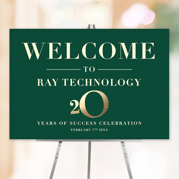 Honor two decades of achievement with this elegant corporate welcome sign designed to celebrate a remarkable 20-year milestone. Featuring a rich emerald green background with gold accents, this sign radiates sophistication and professionalism—perfect for commemorating your business’s journey, growth, and accomplishments.