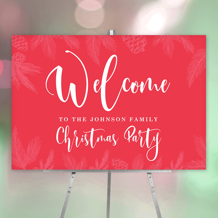 Bring holiday cheer to your celebration with our Christmas party welcome sign, featuring classic pine boughs and pine cones against a rich red background. Designed to evoke the cozy magic of the season, this sign adds a festive and inviting touch to any doorway or entryway.