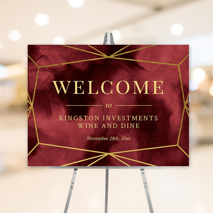 Make a striking first impression with this elegant digital welcome sign, ideal for wine and dine events, corporate dinners, networking galas, or client appreciation nights. Featuring a rich burgundy background and a luxurious gold geometric frame, this design exudes sophistication and professionalism. The text is fully customizable, enabling you to tailor it with your company name, event title, and date. Whether you’re hosting a private business event, fundraising banquet, or executive reception, this welcome sign establishes the tone for a memorable experience.